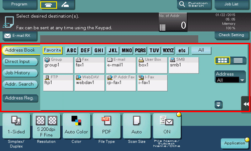 Au besoin, vous pouvez modifier l'affichage de l'écran principal du mode fax/numérisation (par défaut : [Carnet adres]). Pour des détails, voir Ici.