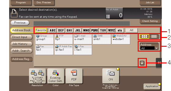 2 | Bascule l'affichage des destinations enregistrées vers le mode Bouton ou Vue Liste. Si vous sélectionnez le mode Vue liste, vous pouvez trier les destinations par numéro d'enregistrement, type de destination ou nom enregistré. |