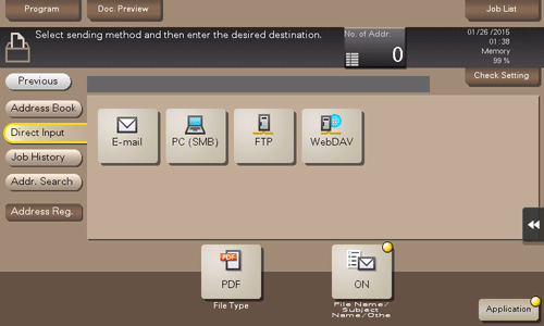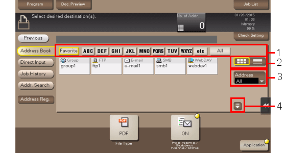 • Pour utiliser le serveur LDAP ou Dossier actif pour spécifier la destination, vous devez enregistrer le serveur sur cette machine. La procédure d'enregistrement est expliquée via Web Connection. Pour des détails, voir Ici.