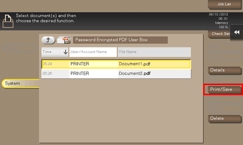 Lorsque l'impression ou l'enregistrement est terminé, le fichier est supprimé automatiquement de la boîte PDF Crypté Mot de Passe.