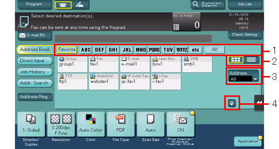 2 | Bascule l'affichage des destinations enregistrées vers le mode Bouton ou Vue Liste. Si vous sélectionnez le mode Vue liste, vous pouvez trier les destinations par numéro d'enregistrement, type de destination ou nom enregistré. |