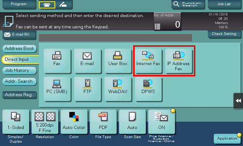 Dans [Saisie directe], tapez sur la touche correspondante du type de destination auquel vous souhaitez enregistrer ou envoyer, puis saisissez les informations de destination.