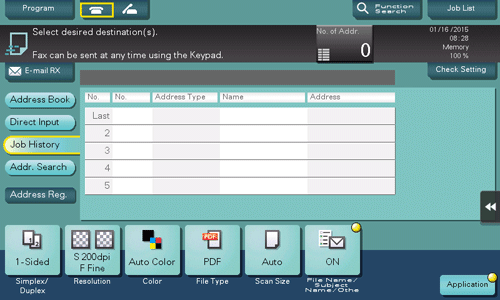 Dans [Histor. tâches], sélectionnez une destination dans l'historique des destinations d'émissions de données numérisées ou de destinations enregistrées.