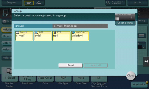 Si une destination groupe est sélectionnée dans [Carnet adres], sélectionnez parmi les destinations enregistrées dans le groupe, les destinations auxquelles vous voulez envoyer les données. S'il y a dans les destinations enregistrées dans le groupe une destination qui n'est pas souhaitée pour l'envoi des données, tapez [Tout sélection], puis tapez sur la destination pour la désélectionner.