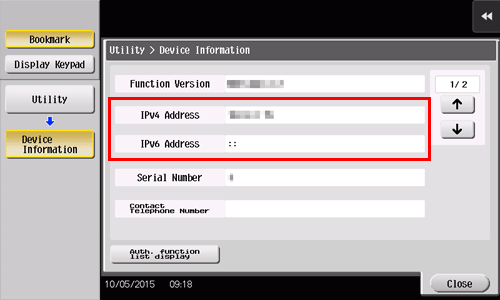 Dans le Panneau de contrôle, sélectionnez [Utilitaire] - [Infos Périphérique], puis confirmez l'adresse IP de cette machine.