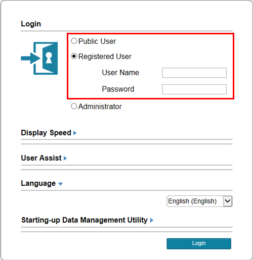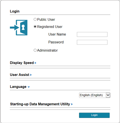 [Connexion] | Sélectionnez un mode de connexion. Le mode de connexion diffère selon le type d'utilisateur. Le Mode utilisateur et le Mode administrateur sont disponibles comme modes de connexion. Pour des détails, voir Ici. |