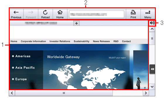 2 | Barre d'outils | En tapant sur une icône de la barre d'outils, vous déplacez et rechargez une page ou affichez et ajoutez un favori. Si vous entrez une adresse URL dans le champ de saisie d'adresse, vous pouvez ainsi visiter directement une page à l'adresse URL spécifiée. La barre d'outils prend en charge les réglages du navigateur Web. Pour des détails sur la barre d'outils, voir Ici. |