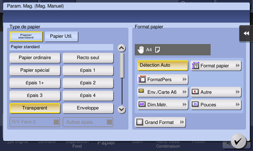 Si vous ne changez pas de type de papier et si vous n'utilisez pas de papier de format personnalisé quand vous ajoutez du papier, vous pouvez utiliser la sélection actuelle sans la modifier.