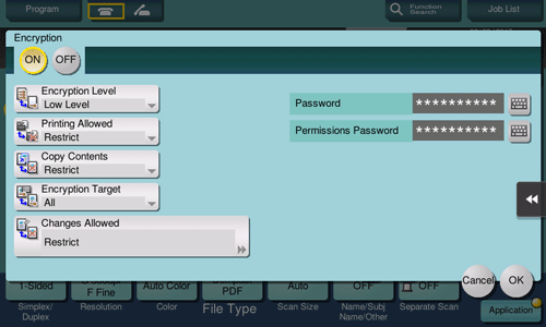 [Niveau de cryptage] | Lors de la spécification des permissions pour un fichier PDF, sélectionnez un niveau de cryptage en fonction du niveau de sécurité que vous voulez spécifier. Si vous sélectionnez [Niveau élevé 1] ou [Niveau élevé 2], vous pouvez spécifier les permissions plus en détail. |