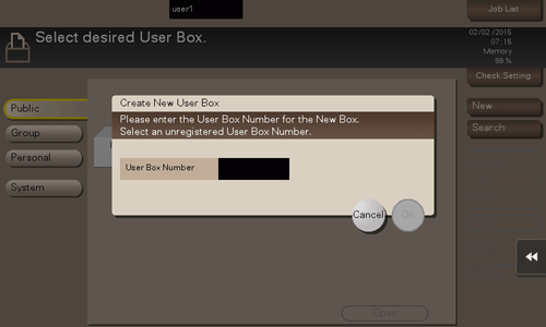 Servez-vous du clavier pour entrer le numéro de la boîte utilisateur que vous voulez enregistrer et tapez sur [OK]. Pour afficher le clavier, tapez sur la zone de saisie des chiffres.