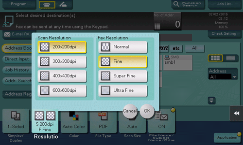 [Résolution de numérisation] | Sélectionnez la définition de l'original pour la transmission de l'image numérisée. Lorsque vous utilisez la fonction Scan vers E‑mail, SMB Send, FTP Send, WebDAV Send ou Enreg. dans Boîte, sélectionnez la résolution suivante pour numériser un original.