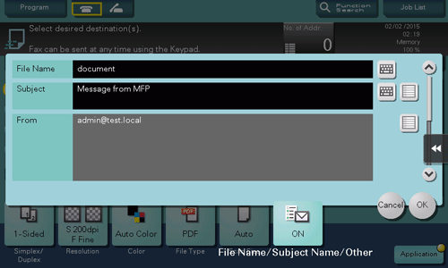 [De] | Si nécessaire, changez l'adresse e-mail de l'expéditeur. Normalement, l'adresse e-mail de l'administrateur est utilisée comme adresse e-mail de l'expéditeur. Si l'authentification est installée sur cette machine, l'adresse e-mail de l'utilisateur connecté est utilisée comme adresse e-mail de l'expéditeur. |