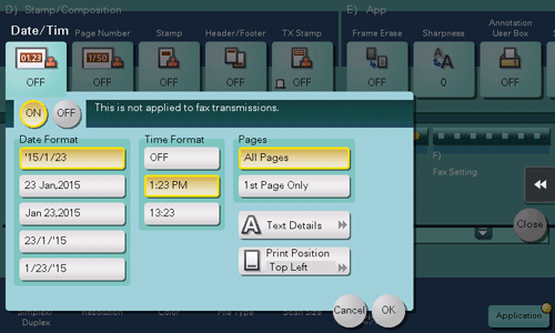 Sélectionnez la position et la représentation des tampons et ajoutez la date et l'heure à laquelle l'original est numérisé. La date et l'heure peuvent être imprimées soit sur toutes les pages, soit uniquement sur la première page.