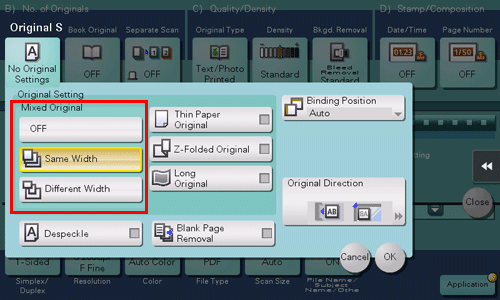 Même pour un original avec des pages de formats différents, le Chargeur ADF vous permet de numériser les données tout en détectant le format de chaque page. Si les largeurs des originaux sont identiques, sélectionnez [Même largeur]. Si les largeurs des originaux ne sont pas identiques, sélectionnez [Largeur différente].
