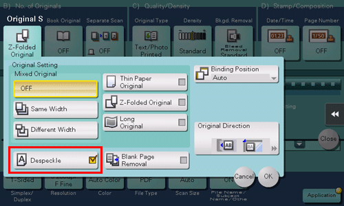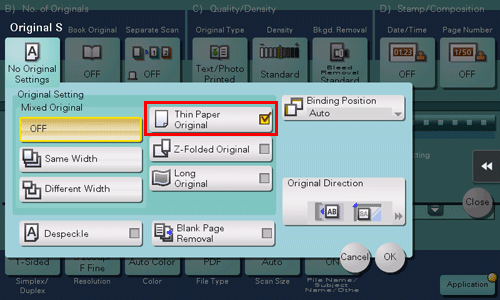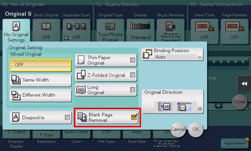 La fonction [Suppression pages vierges] ne peut pas être associée aux fonctions avec lesquelles le format papier n'est pas spécifiable (les fonctions [Original long], [Original Plié en Z], [Originaux mixtes]).