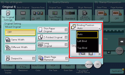 Lorsque vous numérisez un original recto-verso, sélectionnez la position de la reliure de l'original pour éviter que les positions de la reliure ne soient inversées entre la face avant et la face arrière.