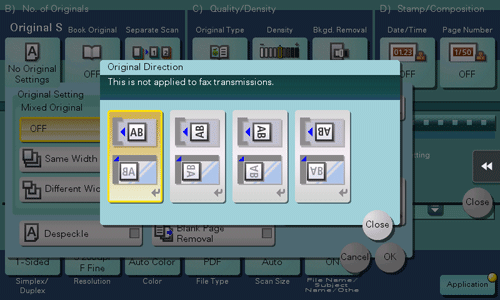 Si vous envoyez un fax ou un fax réseau, la spécification de [Originaux mixtes] est automatique et le réglage [Suppression pages vierges] est annulé.