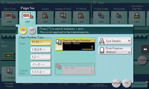 [N° page de départ] | Entrez le numéro de la page de départ à imprimer sur la première page à l'aide du clavier à l'aide du clavier. Pour afficher le clavier, tapez sur la zone de saisie des chiffres. Par exemple, pour imprimer les numéros de page depuis la troisième page, entrez "-1". La première page de l'original est comptée comme "-1" la deuxième page comme "0" la troisième page est comptée comme "1". Dans [N° page de départ], un numéro de page est imprimé sur les pages 1 et suivantes. Si vous entrez "2", les numéros de page sont imprimés dans l'ordre depuis la première page de l'original sous la forme "2, 3", etc. Le "-" (signe moins) se change en + à chaque fois que vous tapez sur [*]. |