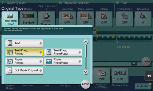 [Papier Copié] | Tapez sur ce bouton pour numériser un original avec la densité uniforme qui est imprimée par le copieur ou l'imprimante avec la qualité d'image optimale. |