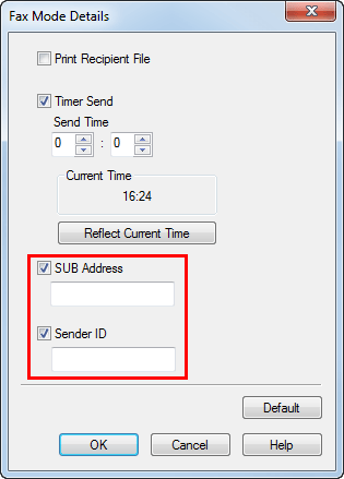 [Inclure informations choisies] | Entrez les informations que vous avez définies aux champs [Entreprise], [Service], [Nom] et [No télécopie] (80 caractères max. pour chaque entrée). Vous pouvez sélectionner cette option si un destinataire a été ajouté à la [Liste des destinataires] de l'écran [Fenêtre éclair Envoi FAX].