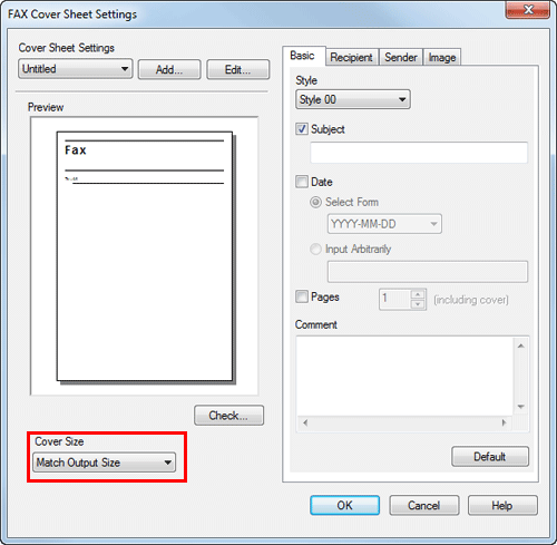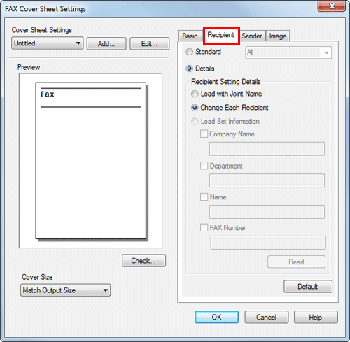 [Détails] | Quand vous ajoutez les informations de destinataire sur la page de garde, définissez un style. Pour ajouter un titre au destinataire, ajoutez-le quand vous définissez le nom de destinataire sur l'écran [Fenêtre éclair Envoi FAX]. | |