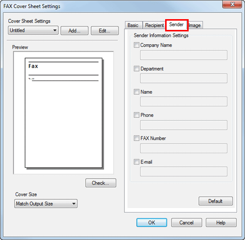 Vous pouvez modifier les données de la page de garde sur l'écran [Paramètres page de garde FAX] qui s'ouvre quand vous cliquez sur [Paramètres...] De même, vous pouvez les définir sur l'onglet [FAX] du pilote de fax.