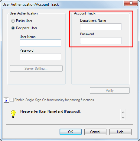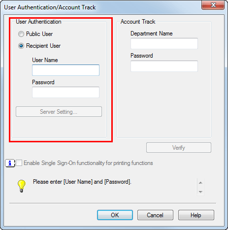 SI l'authentification utilisateur et le compte département (Suivi de Volume) ont déjà été utilisés, chaque utilisateur doit envoyer ses informations d'authentification (le nom d'utilisateur et le mot de passe) à cette machine lors de l'envoi d'un fax PC. Ce qui limite les utilisateurs pouvant envoyer un fax PC via la machine et empêche toute utilisation non autorisée par des tiers.