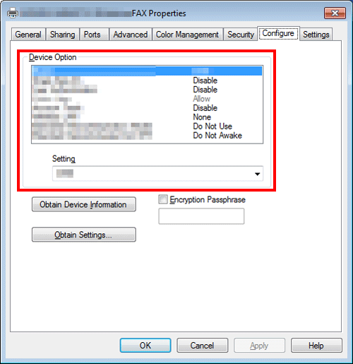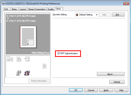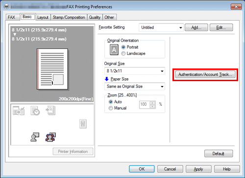 Ouvrez l'onglet [Configurer] du pilote de fax et assurez-vous que la fonction d'authentification utilisateur ou de compte département a été correctement définie.