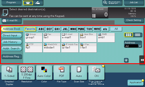 Au besoin, vous pouvez modifier l'affichage de l'écran principal du mode fax/numérisation (par défaut : [Carnet adres]). Pour des détails, voir Ici.