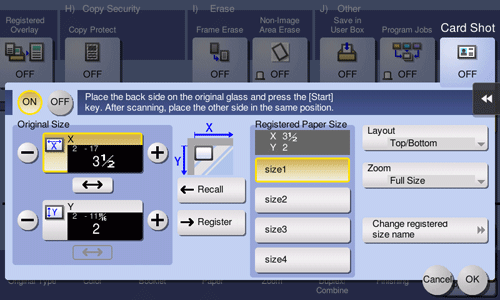 [Taille Original] | Spécifiez la taille de la carte à copier en tapant sur [+]/[-] pour la zone en pouces ou en tapant sur [+]/[-] ou le clavier pour la zone en centimètres. Pour afficher le clavier, tapez sur la zone de saisie des chiffres. Dans [Format enregistré], vous pouvez rappeler un format enregistré auparavant et le spécifier. Après avoir entré le format, sélectionnez une touche dans [Format enregistré] et appuyez sur [Enregistrer]. Le format que vous venez d'entrer est mémorisé. Vous pourrez rappeler le format mémorisé à l'avenir. |