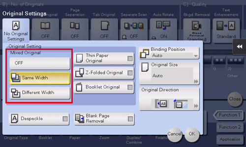Même pour un original avec des pages de formats différents, le Chargeur ADF vous permet de numériser les données tout en détectant le format de chaque page. Si les largeurs des originaux sont identiques, sélectionnez [Même largeur]. Si les largeurs des originaux ne sont pas identiques, sélectionnez [Largeur différente].