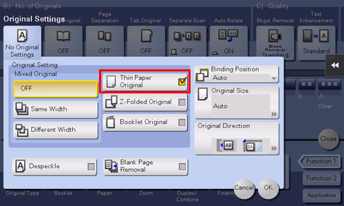 Cette fonction réduit la vitesse de transport de l'original dans le Chargeur ADF afin d'éviter que l'original ne soit coincé lors de la numérisation d'un original plus fin que le papier ordinaire.