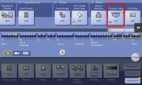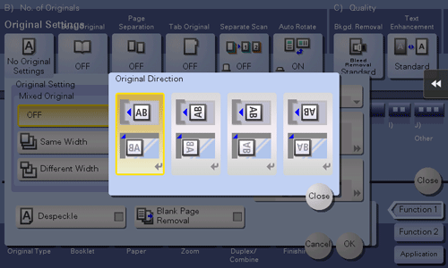 Les originaux sont numérisés avec différents réglages pour chaque jeu et copiés de manière globale. Utilisez cette fonction lorsque plusieurs types d'originaux sont mélangés, par exemple un original recto à imprimer sur une face et un original R/V à copier en l'agrandissant.