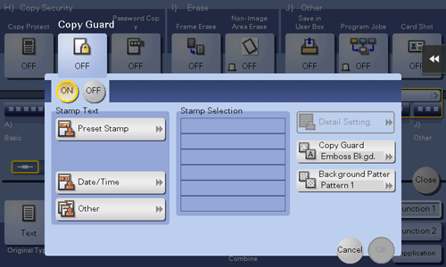 [Type de protection copie] | Sélectionnez un tampon utilisé. Vous pouvez aussi imprimer la date et l'heure.