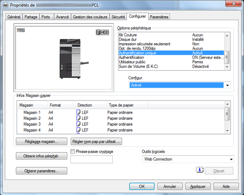Dans [Options périphérique] dans l'onglet [Configurer], vérifiez que le réglage Authentif./Suivi de volume est correctement configuré pour votre environnement d'exploitation.