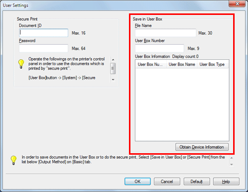 Dans [No. de boîte utilis.], indiquez le numéro de boîte utilisateur que vous avez spécifié à l'enregistrement de la boîte. Vous pouvez voir le [No. de boîte utilis.] dans la liste [Infos Boîte]. En cliquant sur [Obtenir infos périphérique], vous obtenez les dernières informations de la boîte enregistrée sur la machine. Ces informations s'affichent dans la liste [Infos boîte]. Toutefois, la boîte Annotation n'est pas affichée dans la liste [Infos Boîte].