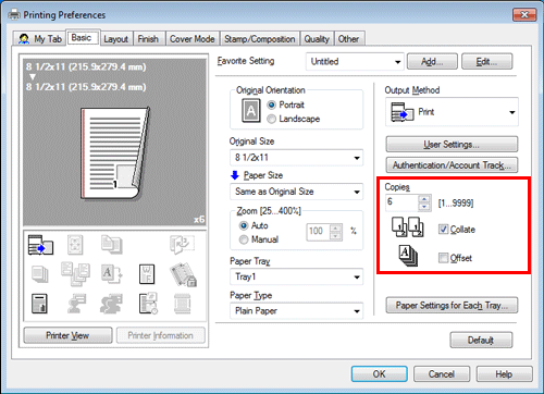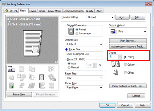 Dans [Copies] de l'onglet [De base], spécifiez le nombre de copies que vous voulez imprimer.
