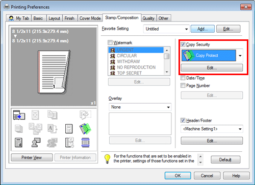 Sous l'onglet [Tampon/Composition], cochez la case [Sécurité Copie] et sélectionnez [Protection Copie].