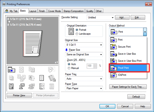 Dans [Type de sortie] dans l'onglet [De base], sélectionnez [Impression épreuve].