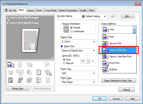 La fonction Save in User Box enregistre les données d'impression dans une boîte sur cette machine. Vous pouvez aussi imprimer les données d'impression en même temps qu'elles sont enregistrées dans la boîte.