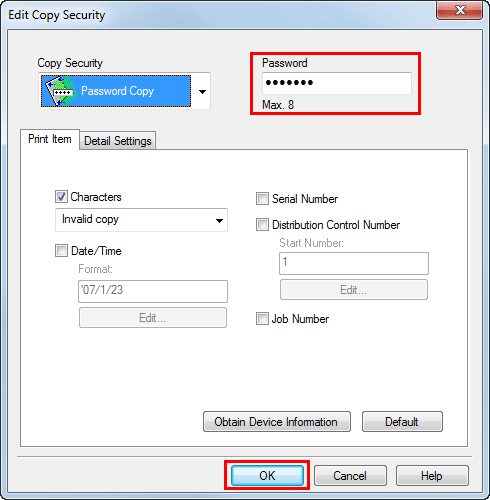 Entrez le mot de passe à insérer (jusqu'à huit caractères) et cliquez sur [OK].
