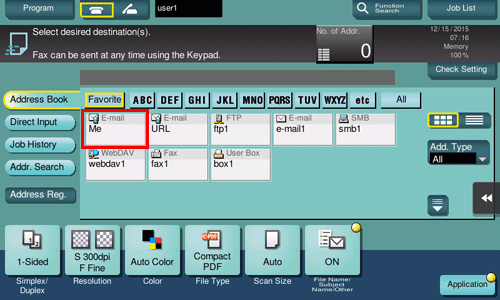 Si vous sélectionnez la touche [URL] affichée sur l'écran [Carnet d'adresses], vous pouvez envoyer par e-mail à votre adresse e-mail, l'URL permettant de télécharger les données d'original numérisées sur cette machine. Lorsque vous connectez à cette machine qui assure l'authentification utilisateur, la touche [URL] apparaît sur l'écran [Carnet d'adresses]. La touche [URL] mémorise l'adresse e-mail de l'utilisateur connecté. Les données d'original numérisées sont enregistrées dans une boîte utilisateur de cette machine sans être jointes à un e-mail pendant la période préspécifiée. De la sorte les données peuvent être acquises indépendamment de la capacité limite de transmission du serveur d'e-mail.