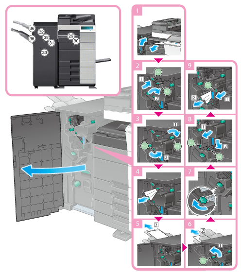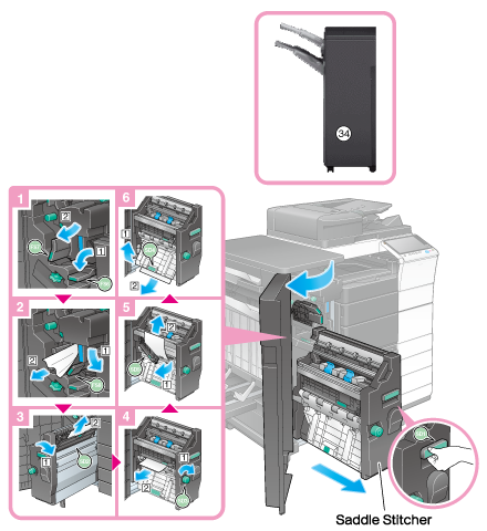 Sections inside the finisher prone to paper jams vary depending on the settings for [Finishing].