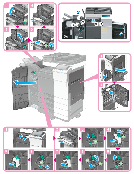 Sections inside the finisher prone to paper jams vary depending on the settings for [Finishing].