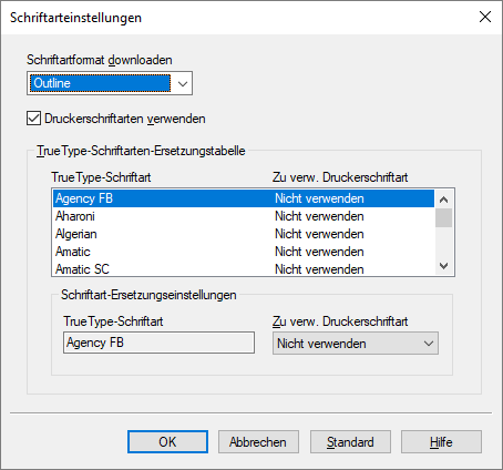 [Druckerschriftarten verwenden] | Aktivieren Sie dieses Kontrollkästchen, um TrueType-Schriften während des Drucks durch Druckerschriften zu ersetzen. Durch die Verwendung von Druckerschriften wird die Druckgeschwindigkeit erhöht. Im normalen Druckbetrieb wird empfohlen, dieses Kontrollkästchen zu aktivieren. |