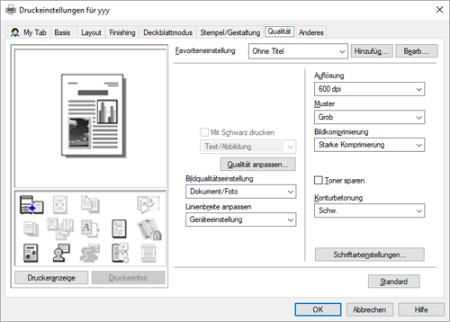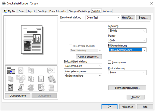 Wenn Sie das Kontrollkästchen [Toner sparen] auf der Registerkarte [Qualität] aktivieren, wird die Druckdichte angepasst, um den Tonerverbrauch zu reduzieren.