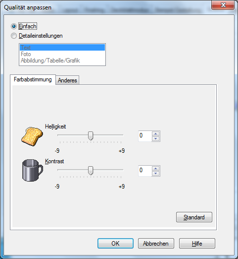 Sie können die Gesamtbildqualität des Originals anpassen und auch die Details jedes Elements des Originals, wie z.B. Text und Fotos, justieren. Wenn Sie den PCL-Treiber verwenden, können Sie die Helligkeit und den Kontrast einstellen.