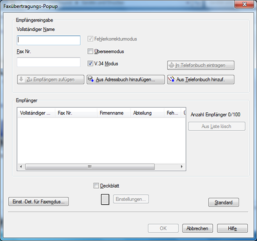 Aus dem Bildschirm [Faxübertragungs-Popup] können Sie Faxempfänger auswählen und die Bedingungen für die Faxübertragung ändern. Sie können den Bildschirm [Faxübertragungs-Popup] folgendermaßen öffnen: