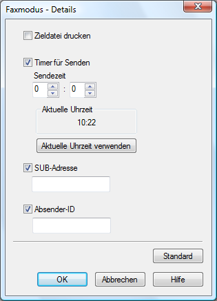 Aktivieren Sie das Kontrollkästchen [Timer für Senden] und legen Sie in [Sendezeit] die Uhrzeit für die Übertragung fest.