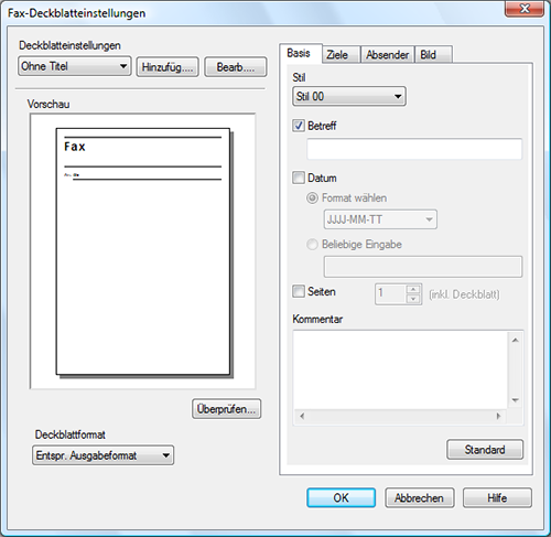[Dok.details] | Wenn Sie die Empfängerinformationen auf das Deckblatt drucken wollen, geben Sie einen Stil an. Um dem Empfänger einen Titel hinzuzufügen, müssen Sie diesen bei der Angabe des Empfängernamens im Bildschirm [Faxübertragungs-Popup] hinzufügen. | |
